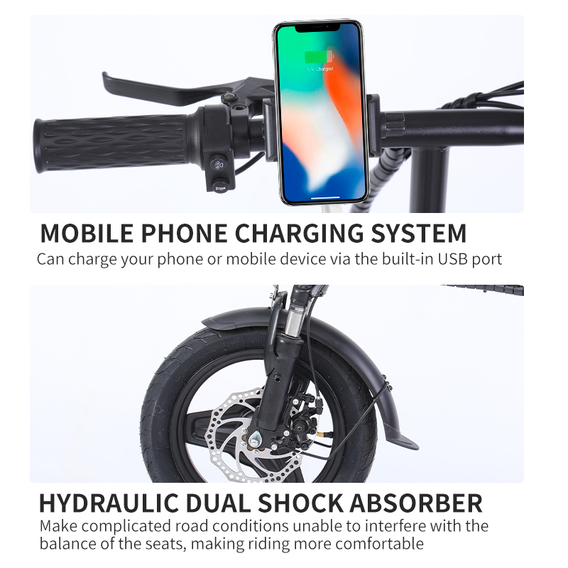 | 1.Motor: 400W brushless full-disc motor 2.Tires: 14*2.50 vacuum tires 3.Battery: 48V - 12A lithium battery compartment 4.Brake mode:Front and rear mechanical disc brakes. 5.Function: mobile phone holder, spotlights and a controller with self-check function. |
